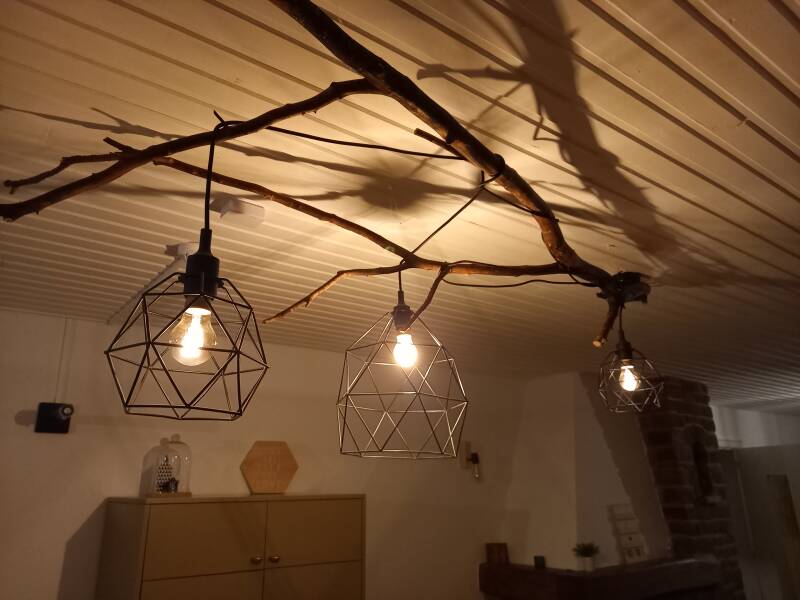 Enkele jaren geleden vonden we een mooie tak in het bos, waar we graag een leuke lamp voor de eettafel van wilden maken. De tak lag sindsdien in het chauffagekot om goed te drogen tot we de juiste lampenkappen zouden vinden.